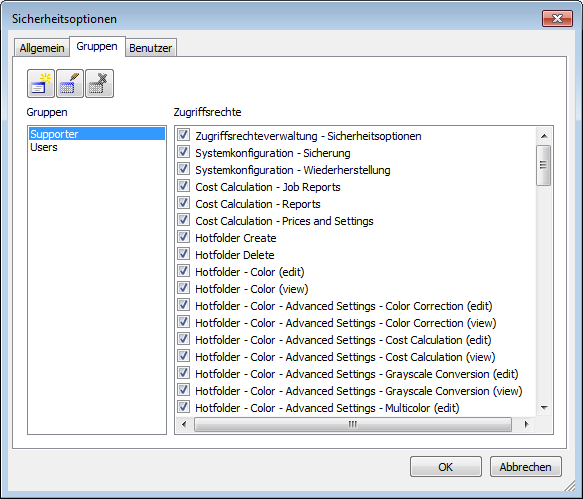 In allen Colorgate Versionen ist ab Version 9 optional eine Benutzerverwaltung integriert, sodass verschiedenen Benutzern / Benutzergruppen unterschiedliche Rechte zugewiesen werden können. Nicht jeder Benutzer ist in der Lage, die umfangreichen Programmoptionen der Software zu beherrschen. Durch die Zugriffsrechteverwaltung ist es jetzt möglich den Benutzern – je nach Fähigkeiten und Wissenstand – persönliche Rechte zuzuweisen, um Fehlbedienung zu vermeiden.