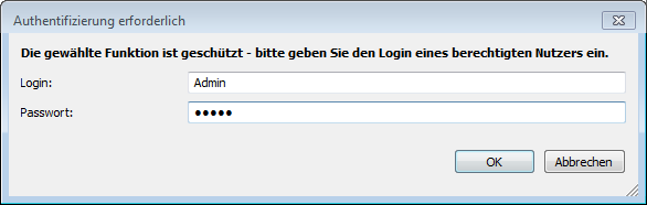 Damit ist es möglich, Änderungen an gesperrten Funktionen oder Einstellungen im Programm einmalig vorzunehmen, wenn man die Zugangsdaten eines Benutzers mit entsprechenden Rechten eingibt.
