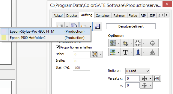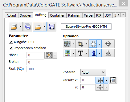 Öffnen Sie die Job Einstellungen, in diesem Beispiel verwenden wir den Epson-Stylus-Pro 4900 HTM. Anschließend passen Sie den Hotfolder, wie gewünscht an (z.B. Schneidemarken, Info Text, Automatisch drehen, zentrieren etc.).