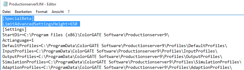 Die Datei befindet sich unter “C:\ProgramData\ColorGATE Software\Productionserver9” und kann mit einem normalen Texteditor wie Notepad bearbeitet werden. Der Ordner “ProgramData” ist allerdings standardmäßig in Windows ausgeblendet, so dass man ggfs. die Explorer-Optionen für versteckte Ordner anpassen muss. Es ist auch möglich den Pfad in die Adressleiste des Explorers einzugeben (bzw. per copy&paste einzufügen), um dorthin zu gelangen. Nach einem Neustart sollte es dann so aussehen: