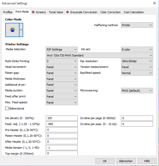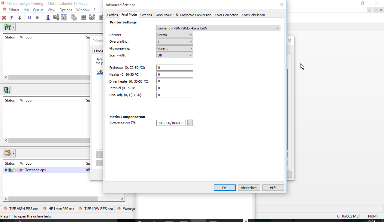 Wer sich den Druckmodus-Reiter mit einer Auflösung von 1280×720 anschaut, wird bemerken, dass die OK/Abbrechen/Hilfe – Knöpfe nicht mehr sichtbar sind: