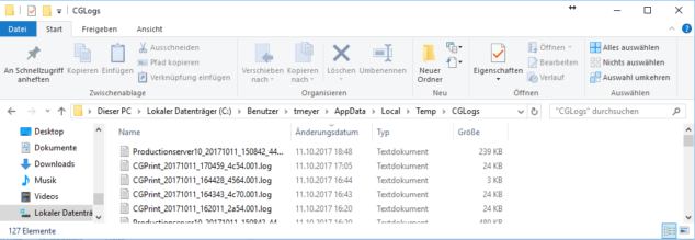 Die Logs befinden sich dann im Temp-Ordner von Windows, standardmäßig C:\Benutzer\****Benutzername****\AppData\Local\Temp\CGLogs. Um dort direkt hinzu gelangen, kann man auch einfach in der Adresszeile “%TEMP%\CGLogs” eingeben.