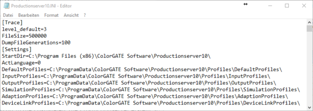 Das reicht aber nicht, damit auch die cgrip.exe und cgprint.exe mehr Informationen liefern. Dafür muss man zunächst ini-Dateien (cgrip.ini und cgprint.ini) mit diesen Zeilen in dem Ordner ablegen, in dem die cgrip.exe und cgprint.exe sich befinden, also standardmäßig C:\Program Files (x86)\ColorGATE Software\Productionserver10.