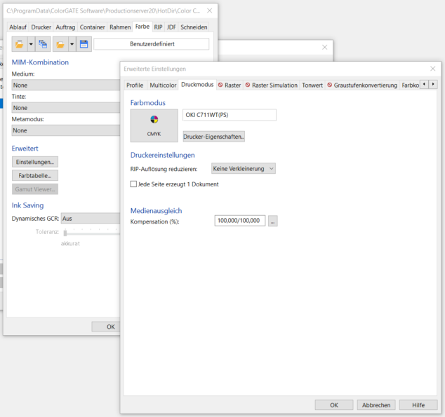 Da normalerweise der Productionserver das Farbmanagement übernehmen soll, sollte man alle Einstellungen dieser Art in den Treibereinstellungen deaktivieren (in diesem Fall unter “Modus”->”Aus (Keine Farbkorrektur)” wählen).