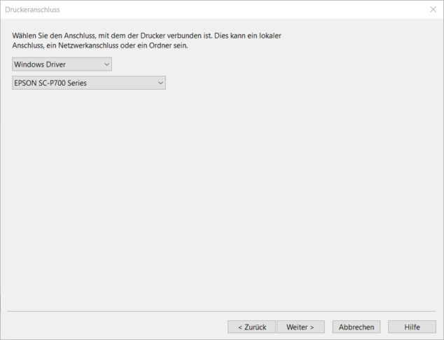 In unserer Software müssen Sie nun zunächst den Assistenten für die Druckereinrichtung starten (“Drucker”->”Neu…”) und dort unter dem Hersteller “***ColorGATE***” den “ColorGATE Windows Printer” wählen. Über zweimaliges Betätigen des “Weiter >”-Knopfs gelangen Sie zum Schritt “Druckeranschluss”. In der Combobox unter “Windows Driver” sollten alle lokal installierten Drucker aufgeführt werden. Hier wählen Sie nun einfach den Drucker, den sie ansteuern möchten. In diesem Beispiel wähle ich den Epson SC-P700.