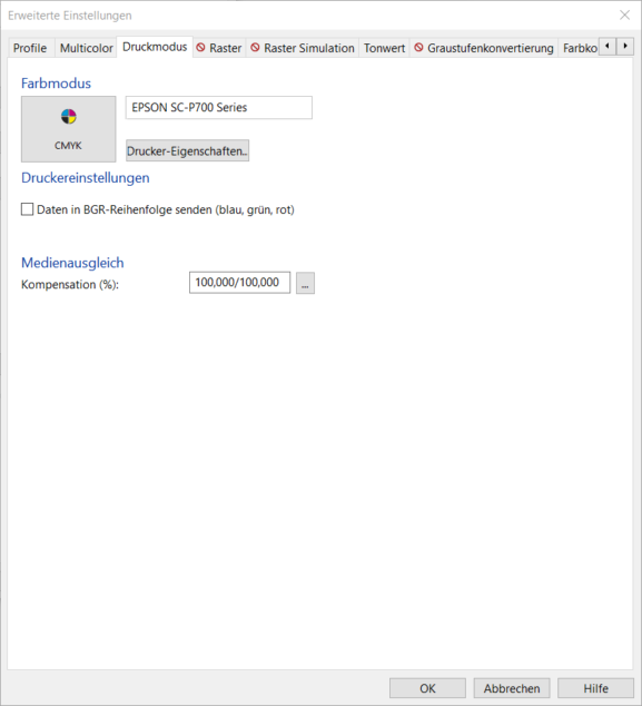 Hier sieht man nun zunächst deutlich weniger Optionen als bei “normalen” Treibern aus unseren Produkten, denn das meiste versteckt sich hinter dem “Drucker-Eigenschaften…”-Knopf. Die Checkbox “Daten in BGR-Reihenfolge senden (blau, grün, rot)” hilft übrigens, wenn die Farbkanäle bei der Ausgabe vertauscht sein sollten. Als Farbmodi stehen hier CMYK und RGB zur Verfügung.