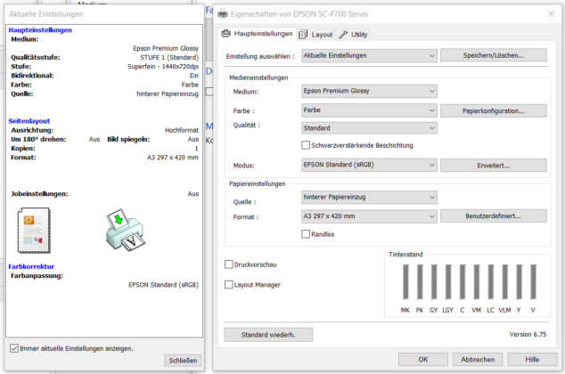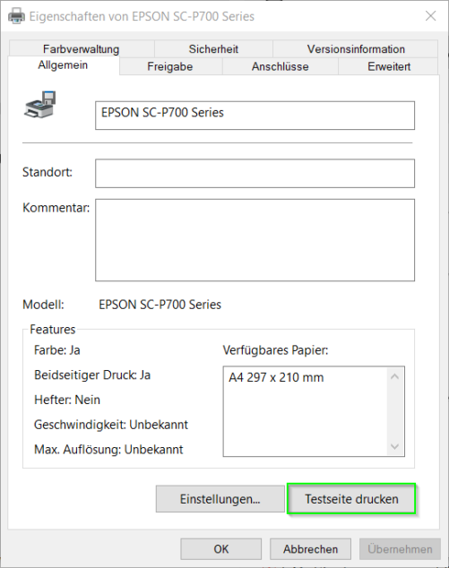 In diesem Beispiel wollen wir einen Epson SC-P700 ansteuern. Der generelle Ablauf ist aber bei anderen Druckern identisch. Zunächst muss natürlich der passende Windows-Treiber von Epson installiert werden. Sie sollten auch gleich testen, ob z.B. die Testseite aus dem Windows-Treiber erfolgreich ausgegeben werden kann. Denn wenn es hier bereits Probleme geben sollte, wird man in Productionserver oder Proofgate wahrscheinlich auch nicht mehr Erfolg haben…
