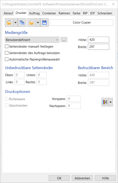 Der Color Copier GDI ist eine Kombination aus dem Windows Printer und dem Color Copier. Er benötigt keinen Postscript-Treiber, bietet aber die “Automatische Papiergrößenauswahl” und die Möglichkeit, Mediengrößen im “Drucker”-Reiter auszublenden. Als Farbmodi stehen hier CMYK und RGB zur Verfügung.