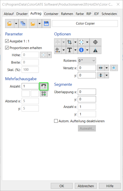 Im Reiter “Auftrag” ist es außerdem möglich, die Mehrfachausgabe über den Drucker machen zu lassen, d.h. anstatt eine Seite z.B. 10x zum Drucker komplett zu senden, wird dem Drucker mitgeteilt, er solle die Seite 10x ausgeben. Dies spart Zeit beim Senden der Druckdaten und sollte auch die Verarbeitungsgeschwindigkeit im Drucker erhöhen.