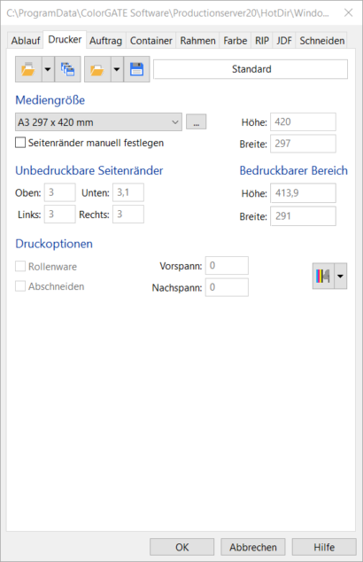 Die Mediengröße sollte aus dem “Drucker”-Reiter übernommen worden sein, wobei es auch Druckertreiber geben kann, wo man dies manuell korrigieren muss.