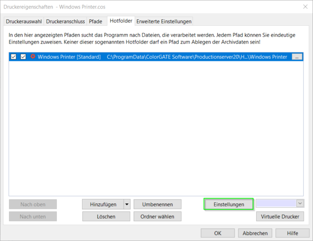 Folgen Sie nun dem Assistenten bis zum “Erweiterte Einstellungen”-Schritt und schließen Sie den Assistenten über “Fertig stellen” ab. Gehen Sie nun direkt wieder auf “Drucker”->”Eigenschaften” und wählen Sie den “Hotfolder”-Schritt. Stellen Sie sicher, dass ein Hotfolder ausgewählt ist.