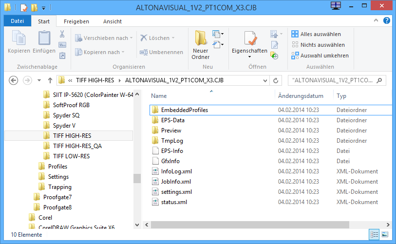 In dem oberen Beispiel befinden sich drei Aufträge im Archiv des „TIFF High-RES“ Druckertreibers. Der Ordnername orientiert sich am Dateinamen der Originaldatei und fügt zudem noch die Endung „.CJB“ hinzu.