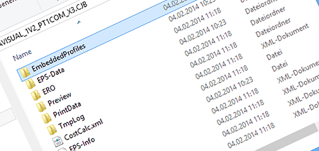 Unter „EPS-Data“ befindet sich die Ursprungsdatei (z.B. PDF, TIFF, usw.). Nur der Dateiname wird gegebenenfalls gekürzt, ansonsten ist die Datei noch im Originalzustand. Wenn man in der Software „Orginaldaten exportieren…“, wird aus diesem Ordner die Datei kopiert.