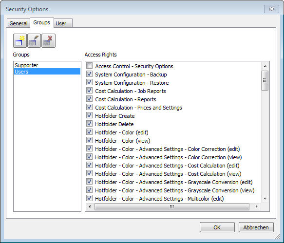 Starting with Version 9 a user rights-management has been integrated as an option in all ColorGATE Products.  With this tool you are able to edit the rights for individual users or user groups. Now it is possible to lock settings or allow limited access to the program to prevent unwanted changes of a running system.