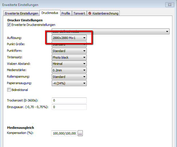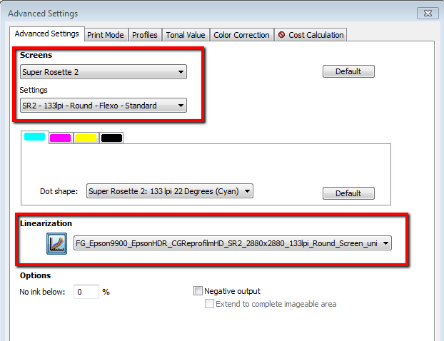 Furthermore, we must ensure that resolution, screening and linearization match. Which screening, however, we are using has no effect when outputting full tones.