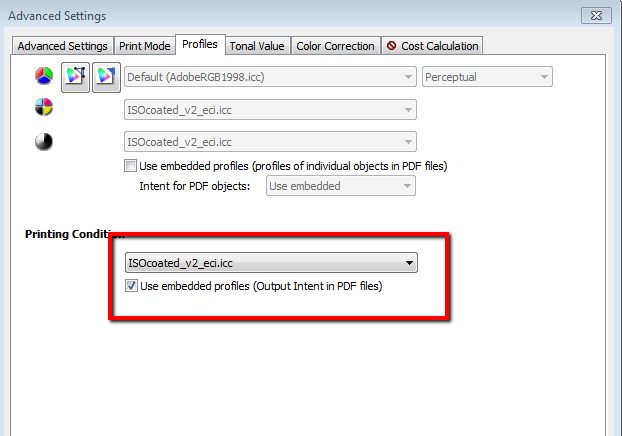 So the color management does not make any changes to the data, the profile of the file (output profile) must match the profile of the printing condition. To do this we choose use “Embedded profiles” under printing condition. Thus, the embedded data in the profile is used as output profile. If no profile exists in the data, the manually selected profile is used. In this case “ISOcoated_v2_eci.icc”. If we want the color management to separate the data, we choose use “Embedded profiles” in the top menu and then select the desired rendering intent.