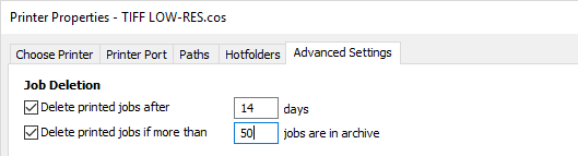 II. Under “Advanced settings” in the “Printer properties” it is also possible to delete printed jobs after a period of time or depending on the number of jobs in the archive.