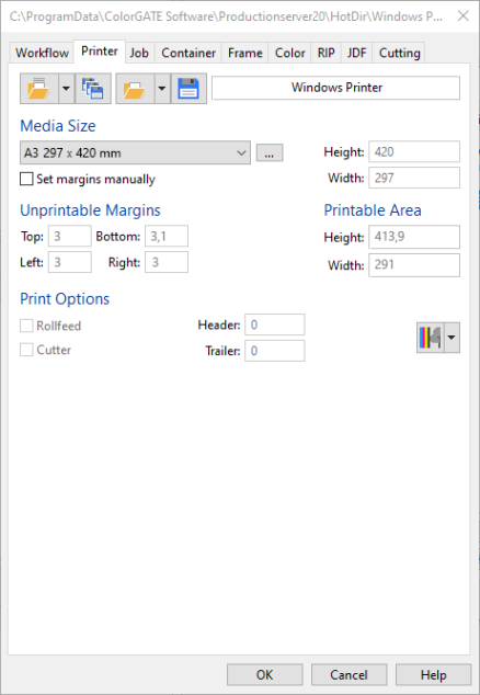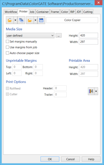 The setup of the “Color Copier” driver is very similar to that of the “Windows Printer” driver. Therefore, I will only describe the differences here. The “Color Copier” driver requires that the device to be controlled has a PostScript driver. In the case of toner printers, it is often the case that both a “PCL” and a “PS” driver are offered by the manufacturer. For the “Color Copier” the PS driver is required.