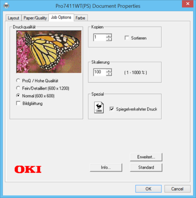 In the following example I want to use an OKI Pro7411WT. Compared to the “Windows Printer” driver, the “Color Copier” driver offers additional functions in the “Printer” tab that are helpful for toner printers.