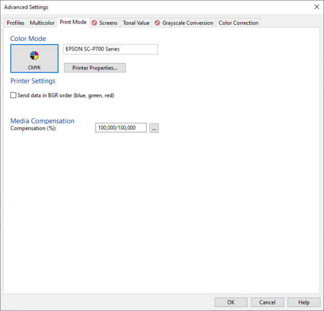 Here you see at first clearly less options than with “normal” drivers within our products, because most of them are hidden behind the “Printer Properties…” button. The checkbox “Send data in BGR order (blue, green, red)” can be useful if the color channels should be swapped during output. The available color modes are CMYK and RGB.