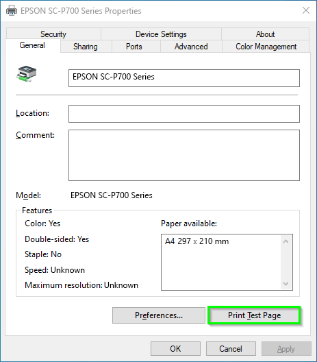 In this example, we will use an Epson SC-P700. However, the general procedure is identical for other printers. First, of course, the appropriate Windows driver from Epson must be installed. You should also test immediately whether, for example, the test page from the Windows driver can be output successfully. If there should already be problems here, you will probably not have any more success in Productionserver or Proofgate…