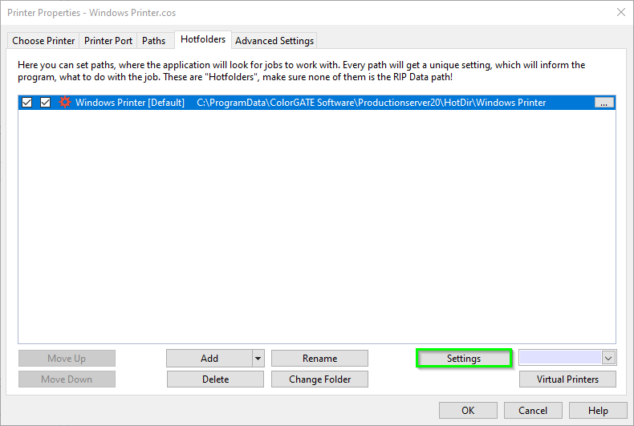 Click on “Settings” to open the settings of the hotfolder. There you can define default settings for jobs that are loaded into that hotfolder.