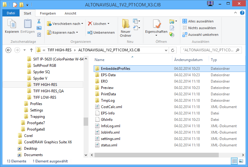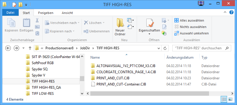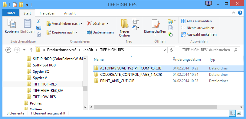 The example above shows three jobs in the archive of the „TIFF High-RES“ printer driver. The folder name is based on the name of the original name and adds the extension “.CJB”. If a folder with the same is already existing, a consecutive number is added to the name.